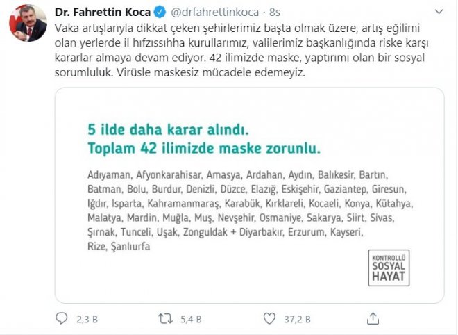 Edinilen bilgilere göre; Sağlık Bakanı Fahrettin Koca saatler 01.46’yı gösterirken çok tartışmaya yaratacak bir tweet attı. Bakan Koca, ‘maske takılması zorunlu kentler’ listesine Diyarbakır, Erzurum, Rize, Şanlıurfa, Kayseri‘nin de eklendiğini duyurdu. Böylece maske takılmadan sokağa çıkılması yasak olan şehir sayısı 42’ye çıktı.