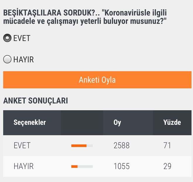 Beşiktaş'ta gerek kaymakamlık gerek belediyenin olağanüstü çalışmaları taktir toplamış olacak ki, www.besiktas.com.tr üzerinden yayınladığımız ankete katılan 3.643 kişiden, 2588 kişi yapılan çalışmaları beğendiği yönünde oy kullandı. 1.055 kişi ise, alınan tedbir ve çalışmaları yeterli bulmadığını belirtti. Bu rakamlara göre, yaklaşık bir hafta içinde yüzde 71 evet dedi, yüzde 29 ise hayır...