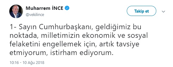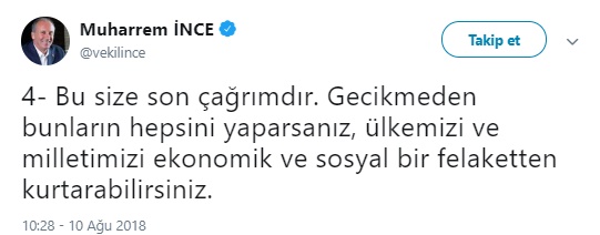 Döviz kurundaki hızlı yükselişin ve Dolar’ın 6 lirayı aşmasının ardından Twitter hesabından paylaşımlarda bulunan Muharrem İnce, Cumhurbaşkanı Erdoğan’a seslendi. Milletimizin sosyal ve ekonomik felaketinin engellenmesi için artık istirham ettiğini söyleyen İnce, dış güçlerle ilgili sözlerini artık bırakmasını isteyerek, bir kez olsun doğru bir yapmasını ve ülkenin felaketini engellemesini istedi. Muharrem İnce, paylaşımlarında şu sözlere yer verdi: