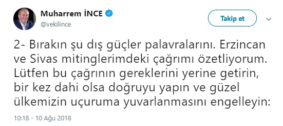 “Sayın Cumhurbaşkanı, milletimizi sosyal ve ekonomik felaketten kurtarmak için artık rica ediyorum. Dış güçler konularını bırakın, Erzincan ve Sivas mitinglerinde yaptığım çağrıyı dikkate alarak gereğini yapın. Bir kez doğru olanı yaparak, bu güzel ülkenin uçuruma yuvarlanmasına engel olun.