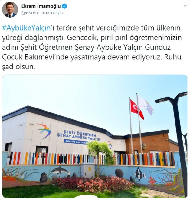 İmamoğlu paylaşımında, “#AybükeYalçın’ı teröre şehit verdiğimizde tüm ülkenin yüreği dağlanmıştı. Gencecik, pırıl pırıl öğretmenimizin adını Şehit Öğretmen Şenay Aybüke Yalçın Gündüz Çocuk Bakımevi’nde yaşatmaya devam ediyoruz. Ruhu şad olsun” ifadelerini kullandı.