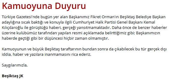 Beşiktaş Başkanı Fikret Orman hakkında Türkiye Gazetesi’nde yer alan bir haberde, Beşiktaş Belediye Başkanlığı adaylığına olumlu baktığı ve bu konu hakkında da CHP Genel Başkanı Kemal Kılıçdaroğlu ile görüştüğü ile ilgili yazının gerçeği yansıtmadığı ifade edilerek , daha önceleri de yanlış olan benzer haberlerin siyah-beyazlı kulüp tarafından yapılan resmi açıklamalarla belirtilerek, Başkan Orman’ın haberde bahsedildiği şekilde bir düşüncesinin hiçbir zaman olmadığı belirtildi.