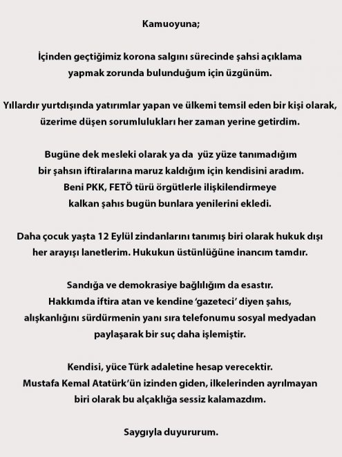Sandığa ve demokrasiye bağlılığım da esastır. Hakkımda iftira atan ve kendine 'gaeteci' diyen şahıs, alışkanlığını sürdürmenin yanı sıra telefonumu sosyal medyadan paylaşarak suç işlemiştir.