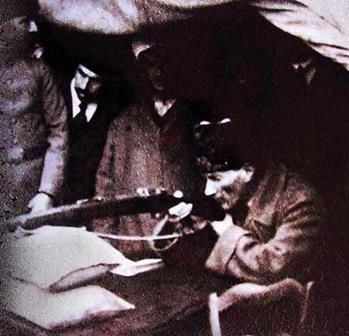 Kurtuluş Savaşı sırasında Mustafa Kemal paşa, 1903 model Türk mavzeri ile nişan alıyor.
