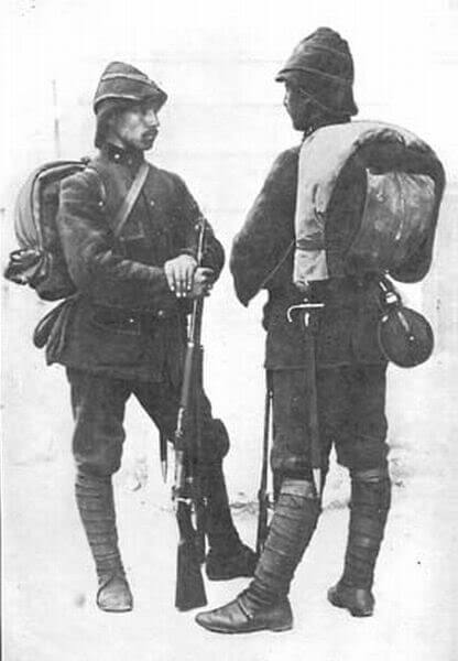 Birinci Dünya Savaşı'ndaki Osmanlı askerinin klasik teçhizatı. Sırt çantası, matara, kasatura (süngü) ve kütüklük gibi eşyalardan oluşan bu teçhizatın en önemli öğesi tüfektir. Resimdeki askerin elinde 1903 model Türk mavzeri mevcuttur.