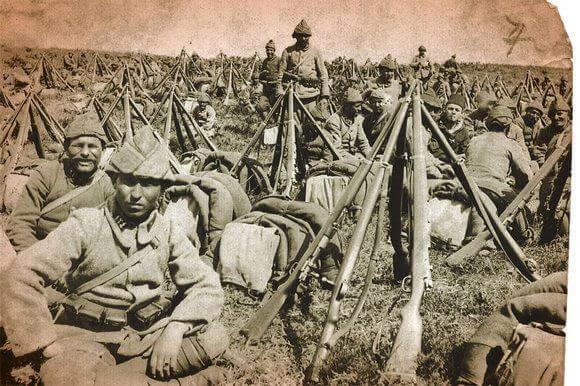Çanakkale Muharebeleri esnasında Osmanlı askerlerinin bir foroğrafı. Sağda duran tüfeklerin 1903 model Türk mavzeri olduğunu görmek mümkündür.