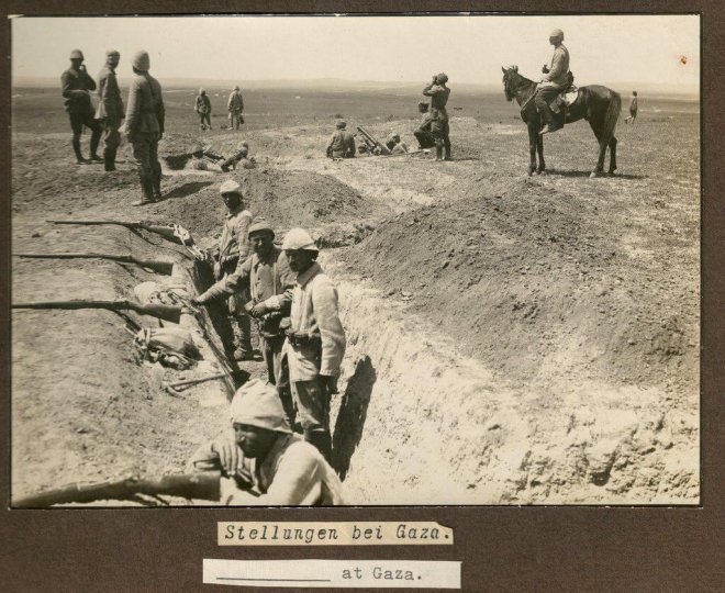 Gazze siperlerindeki Osmanlı askerleri. Erlerin karşısında 1903 model Türk mavzerlerini görmek mümkündür.