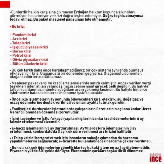 CHP'li Muharrem İnce'de Twitter hesabından Koronavirüs paketini eleştirerek aşağıdaki ifadelere yer verdi: