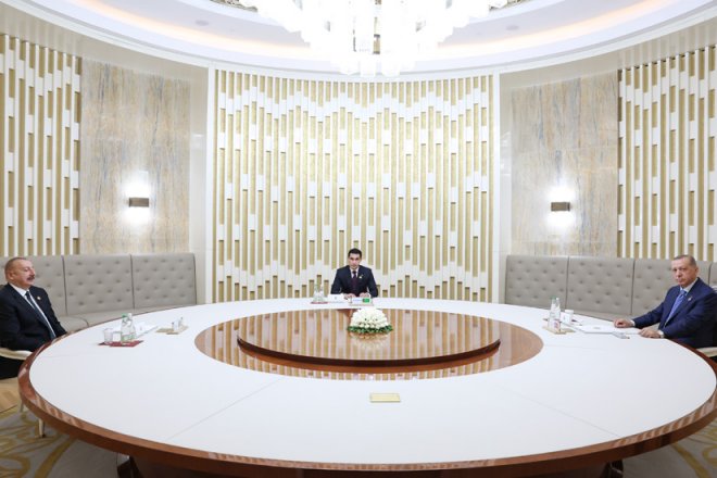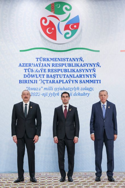 Türkiye-Azerbaycan-Türkmenistan Devlet Başkanları Birinci Zirvesi’nde Cumhurbaşkanı Erdoğan, Türkmenistan Devlet Başkanı Serdar Berdimuhamedov ve Azerbaycan Cumhurbaşkanı İlham Aliyev ile dar katılımlı ve heyetler arası görüşmeler gerçekleştirdi.