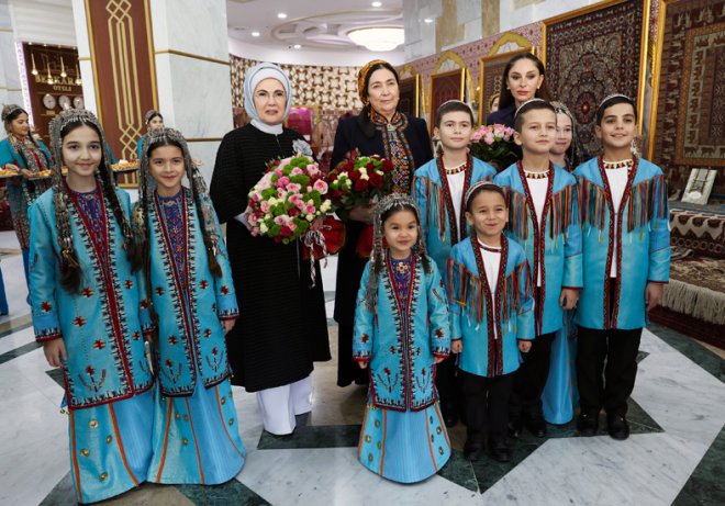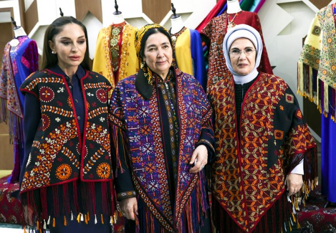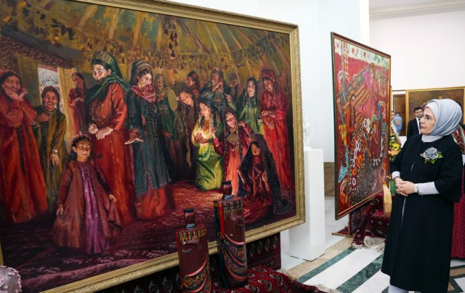 Türkmenistan ziyaretinde Cumhurbaşkanı Erdoğan'a eşlik eden Emine Erdoğan, serginin düzenlendiği alana Azerbaycan Cumhurbaşkanı İlham Aliyev'in eşi Mihriban Aliyeva ve Türkmenistan Halk Meclisi Başkanı Kurbankulu Berdimuhamedov'un eşi Oğulgerek Berdimuhamedova ile geldi.
