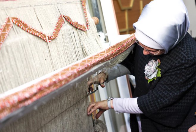 Türkmen kına gecesi ve Türkmen düğününün canlandırıldığı gösteriyi de izleyen Emine Erdoğan ile Aliyeva ve Berdimuhamedova, daha sonra keçe-kilim dokuma atölyesini ziyaret etti. Emine Erdoğan ile Oğulgerek Berdimuhamedova, bir dokuma tezgâhının başına geçerek tezgâhtaki kilime ilmek attı.