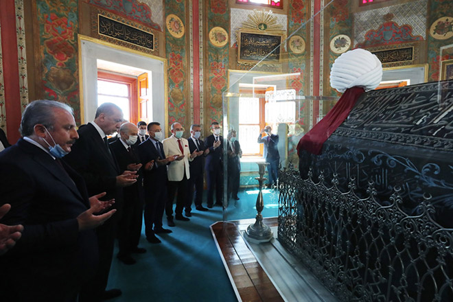 MHP Genel Başkanı Devlet Bahçeli ile aynı araçla gelerek, ziyaret ettiği türbenin girişinde basın mensuplarının sorularını cevaplayan Cumhurbaşkanı Erdoğan, 86 yıllık bir süreç sonunda, Cumhur İttifakı olarak MHP Genel Başkanı Devlet Bahçeli ile gayretleri neticesinde, yargının artık hakikati görmesiyle Ayasofya-i Kebir Cami-i Şerifi'nin aslına döndüğünü söyledi.