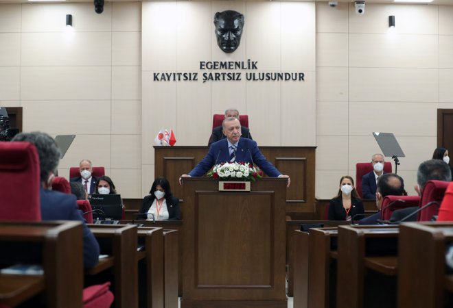 Cumhurbaşkanı Erdoğan, Rum tarafının Doğu Akdeniz'de de Kıbrıs Türk halkının müktesep haklarını yok sayma çabasını ısrarla sürdürdüğünü, hidrokarbon kaynaklarının idaresi ve hakkaniyetle paylaşımı konusunda KKTC'nin tüm önerilerini ellerinin tersiyle ittiğini belirtti.