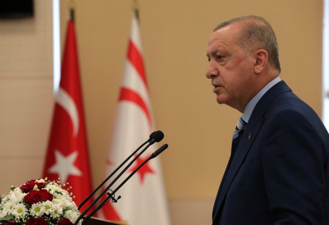 Doğu Akdeniz’de hem kendi hak ve çıkarlarını hem de Kıbrıs Türkü’nün hak ve çıkarlarını korumakta kararlı olduklarına işaret eden Cumhurbaşkanı Erdoğan, sözlerini şöyle sürdürdü: “Arzumuz bölgenin huzur, barış, istikrar, iş birliği ve refahla anılmasıdır. Bu doğrultuda yapıcı öneriler sunuyor, fırsatları birlikte değerlendirme tekliflerinde bulunuyoruz. İlgili tüm tarafların yer alacağı Doğu Akdeniz Konferansı önerimiz, bu yöndeki irademizin tezahürlerinden biridir. Hidrokarbon kaynaklarının adilane paylaşımına dair Kıbrıs Türk tarafının iş birliği önerisi gibi bu teklif de hala masadadır ancak Kıbrıs Türkü’nün tüm iş birliği çağrılarına kulak tıkayan Rum tarafı sonbaharda sondaj çalışmalarına yeniden başlayacağını duyurdu. Kimin tek yanlı faaliyetler gerçekleştirdiğinin, kimin gerginliği artırdığının muhakemesini uluslararası toplumun vicdanına bırakıyorum. Türkiye ve Kuzey Kıbrıs Türk Cumhuriyeti olarak biz haklarımızı korumak adına ne yapılması gerekiyorsa onu yapacağız. Ülkelerimizi tek taraflı kararlarla yolundan çevirebileceklerini sananlara diplomasi ve ekonomi başta olmak üzere her alanda gerçekleri göstermek boynumuzun borcudur.”