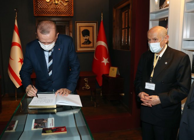 Cumhurbaşkanı Erdoğan, Lefkoşa'da MHP'nin Kurucu Genel Başkanı Alparslan Türkeş'in doğduğu müze evi ziyaret etti.