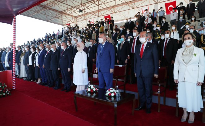 Cumhurbaşkanı Recep Tayyip Erdoğan, Kuzey Kıbrıs Türk Cumhuriyeti’nde (KKTC) Kıbrıs Barış Harekâtı’nın 47. yıl dönümü nedeniyle düzenlenen 20 Temmuz Barış ve Özgürlük Bayramı Töreni’ne katıldı. Saygı duruşu ve İstiklal Marşı’nın okunmasıyla başlayan törende, Cumhurbaşkanı Erdoğan ve KKTC Cumhurbaşkanı Ersin Tatar, tören birliklerini denetledi ve halkı selamladı.
