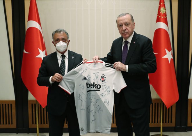 Başkanımız Ahmet Nur Çebi, Cumhurbaşkanı Sayın Recep Tayyip Erdoğan’a futbolcularımızın imzaladığı Beşiktaş formalarını takdim etti."