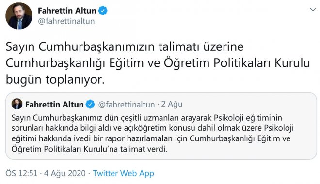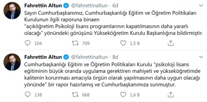 İletişim Başkanı Fahrettin Altun, Erdoğan’ın rapor üzerine ‘açıköğretim psikoloji lisans programlarının kapatılmasının daha yararlı olacağı’ yönündeki görüşünü Yükseköğretim Kurulu Başkanlığı’na (YÖK) bildirdiğini açıkladı.