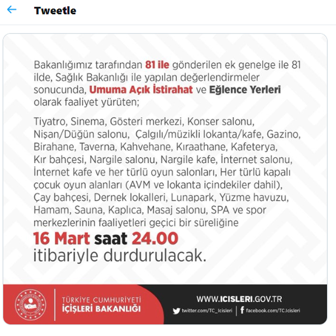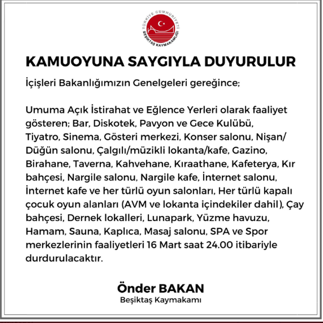 Türkiye'de Koronavirüs vakalarının artmasıyla, vatandaşın can güvenliğini korumak adına pek çok tedbir alınıyor. Beşiktaş Kaymakamlığı'da, İçişleri Bakanlığı genelgesi uyarınca faaliyetleri saat 24:00 itibariyle durduracak yerleri kamuoyuna açıklayan bir duyuru yayınladı. Duyuruda aşağıdaki ifadelere yer verildi: