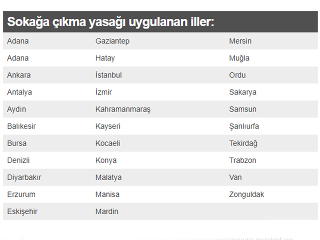 Edinilen bilgilere göre; Erdoğan açıklamasında, geçen hafta giriş-çıkış yasağının sonlandırıldığı yedi ile ek olarak dokuz ilde de yasağın sonlandırılacağını söyledi. Bu iller, Adana, Diyarbakır, Mardin, Trabzon, Ordu, Denizli, Kahramanmaraş, Şanlıurfa ve Tekirdağ olarak sıralandı.