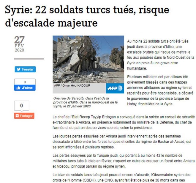 Agence France-Presse (AFP) ise haberi “Suriye: 22 Türk askeri öldü, büyük gerginlik tırmanıyor” manşetiyle duyurdu. Haberde ise, “Perşembe günü Suriye’nin kuzeybatısında ciddi bir insani krizle boğuşan ve gerginliğin arttığı İdlib eyaletinde 22 Türk askeri öldü” denildi.