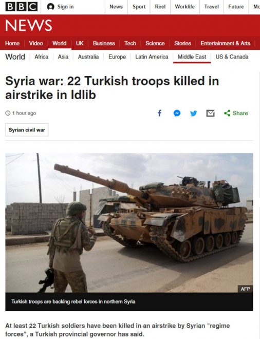 İngiliz yayın kuruluşu BBC, İdlib’de yaşanan gelişmeyi “Suriye Savaşı: İdlib’deki hava saldırısında 22 Türk askeri öldü” manşetiyle duyurdu.