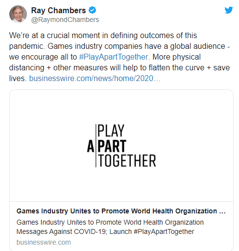 Aralarında Twitch ve Activision Blizzard gibi önemli firmaların da bulunduğu 18 video oyun şirketi insanların evlerinde oyun oynayarak sosyalleşebilmeleri adına #PlayApartTogether kampanyasını başlattı. Asıl önemli nokta ise söz konusu kampanyanın destekçileri arasında Dünya Sağlık Örgütü'nün bulunması. Dünya Sağlık Örgütü global strateji elçisi Ray Chambers Twitter üzerinden bir açıklama yayınladı.