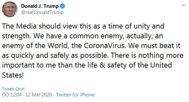 ABD Başkanı Trump, bu mesajından kısa bir süre sonra ulusa sesleniş konuşması yaptı. Covid-19 isimli salgın hastalık ile ilgili açıklamalarda bulunan Trump, Birleşik Krallık haricinde Avrupa Birliği ülkelerine seyahat kısıtlaması getirdi.