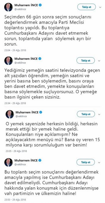Son olarak Muharrem İnce, Parti Meclisi toplantısı seçim sonuçlarını değerlendirmek amacı ile toplandıysa, buraya Cumhurbaşkanı adayının da davet edilmesi gerektiğini vurgulayarak, “Cumhurbaşkanı adayı hakkında yalan sözler söylemek için gerçekleştirilmiş ise; partimizin ve ülkemizin vah haline” ifadelerini kullandı.