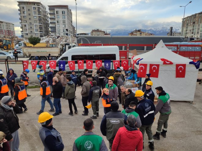 Günlük 6 bin kişi kapasiteli yemek tırı, günlük 15 bin ekmek kapasiteli mobil fırının bölgede kurulumu tamamlandı ve gün içerisinde hizmet vermeye başladı. 33 Palet Hamidiye Su taşıyan 5 tır İBB Hatay Lojistik Merkezi’ne ulaştı ve ilk sıcak yemeğini dağıttı. 200 ekmek ve 11.400 bebe bisküvisi taşıyan 2 tır da bölgeye ulaştı.