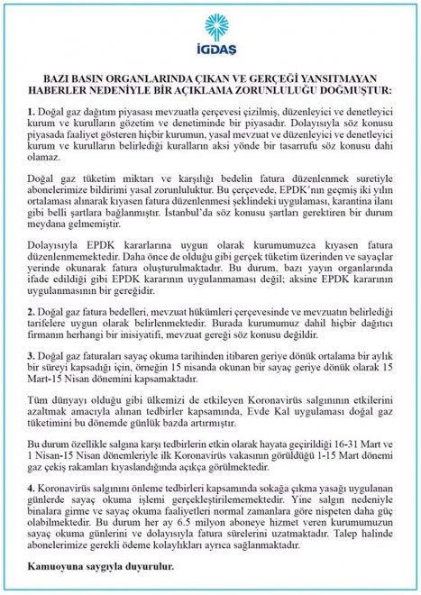 İstanbul Gaz Dağıtım Sanayii ve Ticaret A.Ş. (İGDAŞ), doğal gaz faturalarıyla ilgili basında yer alan haberler nedeniyle yazılı bir açıklama yaptı. Sözcü'den edinilen bilgilere göre; İstanbul’da EPDK kararlarına uygun olarak kıyasen fatura düzenlenmesini gerektirecek şartların bulunmadığı belirtilen açıklamada şu ifadeler yer aldı: