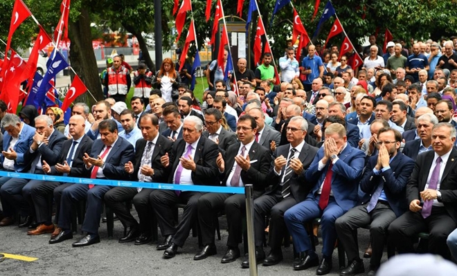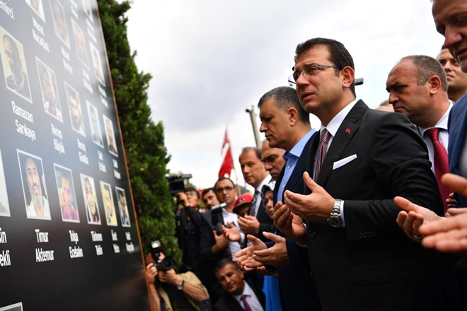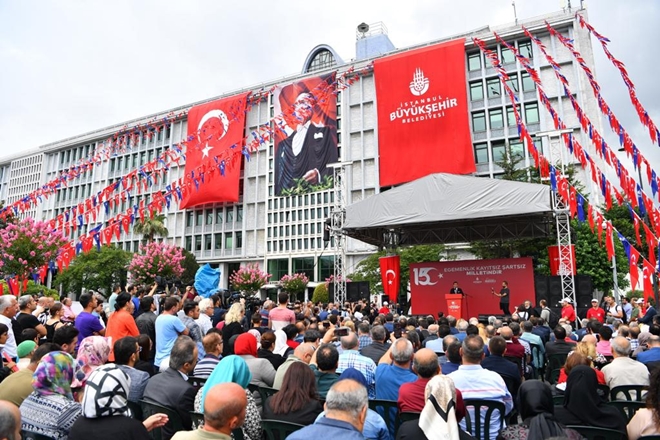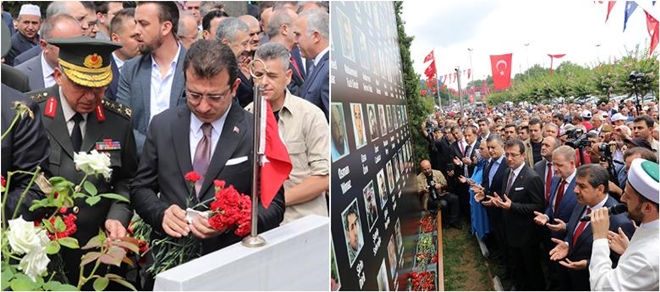 İstanbul Büyükşehir Belediyesi Başkanı Ekrem İmamoğlu, Edirnekapı Şehitliği ve İBB önündeki 15 Temmuz anma törenlerine katıldı. İmamoğlu, “Bir daha böylesi alçaklıkların yaşanmaması için gerekli şartları oluşturmanın önümüzdeki en önemli görevlerden biri olduğunu asla ve asla unutmamalıyız. Herkesi her kesimi kolayca suçlu, terörist ilan etmeye dayalı bir siyaset dilinin, gerek gerçek suçlu, düşman ve teröristlerin faaliyetlerini örtmekten başka hiçbir işe yaramadığı herkesçe net olarak anlaşılmalıdır” dedi.