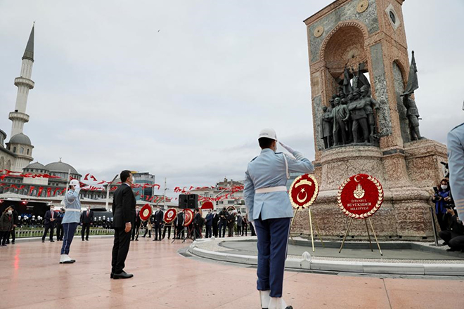 Türkiye Cumhuriyeti’nin kurucusu, ulu önder Mustafa Kemal Atatürk, ölümünün 82’nci yıldönümünde, Taksim Cumhuriyet Anıtı’nda düzenlenen resmi törenle anıldı. İBB'den edinilen ilgilere göre; Atatürk için düzenlene tören; İstanbul Valisi Ali Yerlikaya, 1’nci Ordu Komutanı Orgeneral Musa Avsever ve İstanbul Büyükşehir Belediye (İBB) Başkanı Ekrem İmamoğlu’nun, kurumları adına Cumhuriyet Anıtı’na çelenk bırakmalarıyla başladı. İstanbul Barosu, siyasi partiler ve çeşitli sivil toplum kuruluşları da anıta çelen koydu. Çelenk merasiminin ardından; Mustafa Kemal Atatürk, silah arkadaşları ve tüm şehitler için 2 dakikalık saygı duruşunda bulunuldu. Tören, İstiklal Marşı’nın okunmasıyla son buldu.