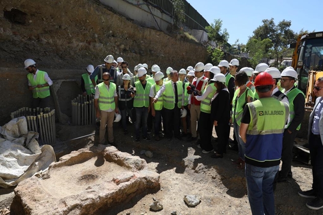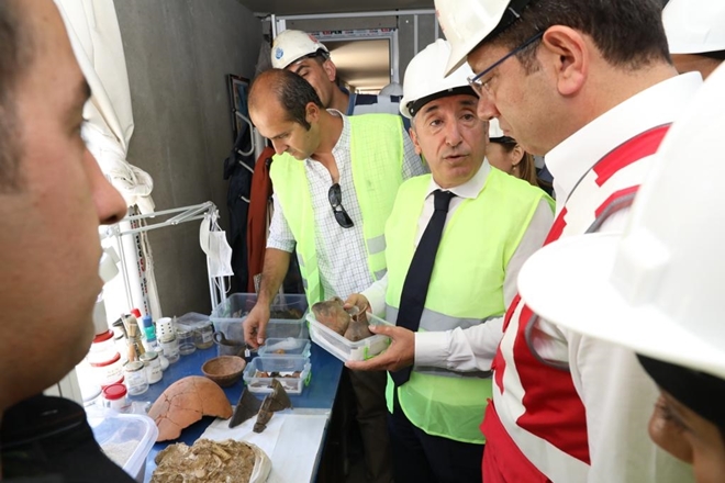 İstanbul Büyükşehir Belediye (İBB) Başkanı Ekrem İmamoğlu, bayramın ikinci gününü İstanbul’da yapımı devam eden metro ve meydan düzenlemesi şantiyelerini dolaşmaya ayırdı. Yanına ortanca oğlu Semih’i alan İmamoğlu, ilk olarak Kabataş – Mahmutbey Metrosu’nun Beşiktaş istasyonu şantiyesinde incelemelerde bulundu. İstanbul Arkeoloji Müzeler Müdürü Rahmi Asal, metro kazısı sırasında tarihi eserlere rastlanmasıyla gündeme gelen ve koruma altına alınan bölge ile ilgili İmamoğlu’na teknik bilgiler verdi. Asal, metro kazıları sırasında, Osmanlı ve Bizans döneminden kalma eserler ile birlikte Tunç Çağı’ndan kalma bir mezarlığa rastlandığı bilgisini İmamoğlu ile paylaştı. Asal, İmamoğlu’na, yaklaşık 5 bin 500 yıllık olduğu düşünülen mezarlıktan çıkarılan ve araç-gereç olarak kullanılan bazı örnekleri gösterdi. Asal, acil korunmaya alınması gereken tarihi eserleri kayıt altına alarak müzelere yolladıklarını, kalan eserlerin ise metro istasyonu girişinde halkın ziyaretine açılacağını belirtti.