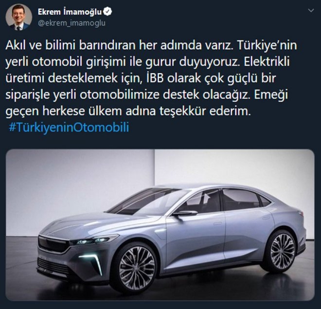 İstanbul Büyükşehir Belediye Başkanı Ekrem İmamoğlu, tanıtımı yapılan ve Cumhurbaşkanı Recep Tayyip Erdoğan tarafından ilk deneme sürüşü gerçekleştirilen yerli otomobil ile ilgili Twitter hesabından paylaşımda bulundu. Otomobilin fotoğrafını paylaşan İmamoğlu bu girişimle gurur duyduklarını belirterek, İBB'nin güçlü bir siparişle yerli otomobile destek olacağını duyurdu.