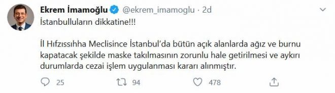 İstanbul Büyükşehir Belediye Başkanı Ekrem İmamoğlu, maske zorunluluğu kararına ilişkin sosyal medya hesabından yaptığı açıklamada şu ifadeleri kullandı: