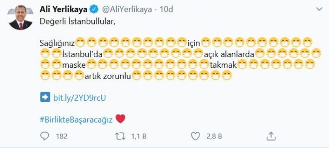 Vali Yerlikaya maskeli emojiyi kullanarak yaptığı paylaşımında, “Değerli İstanbullular, sağlığınız için İstanbul'da açık alanlarda maske takmak artık zorunlu” ifadelerini kullandı.