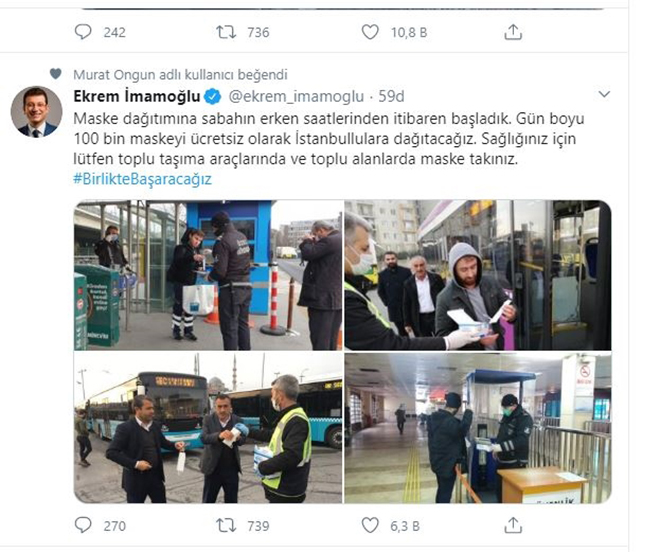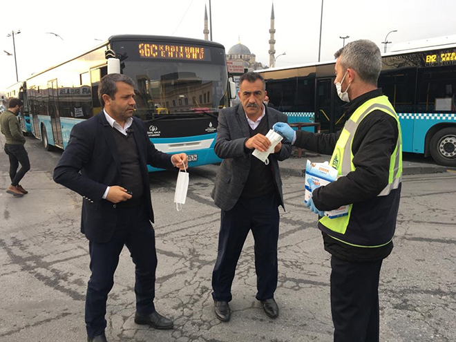 İBB Başkanı Ekrem İmamoğlu da sabah saatlerinde sosyal medyadan bir paylaşımda bulunarak, “Maske dağıtımına sabahın erken saatlerinden itibaren başladık. Gün boyu 100 bin maskeyi ücretsiz olarak İstanbullulara dağıtacağız. Sağlığınız için lütfen toplu taşıma araçlarında ve toplu alanlarda maske takınız” dedi.