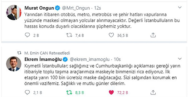 İstanbul Büyükşehir Belediyesi Sözcüsü Murat Ongun, açıklamanın hemen ardından toplu ulaşım araçlarına maskesiz yolcu alınmayacağını, İBB’nin de maske dağıtacağını belirten bir mesaj paylaştı.
