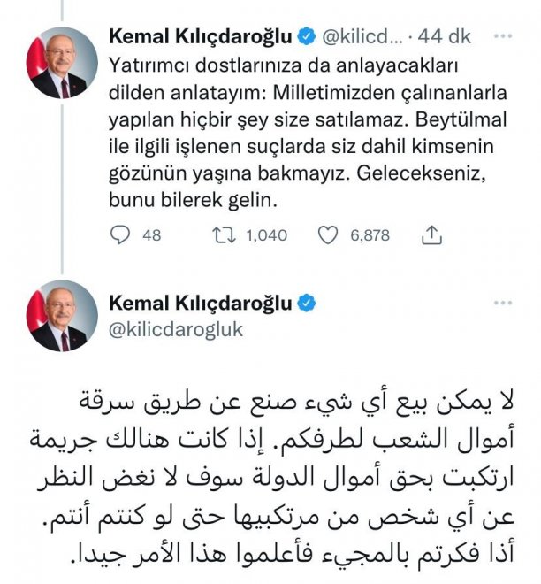 * Yatırımcı dostlarınıza da anlayacakları dilden anlatayım: Milletimizden çalınanlarla yapılan hiçbir şey size satılamaz. Beytülmal ile ilgili işlenen suçlarda siz dahil kimsenin gözünün yaşına bakmayız. Gelecekseniz, bunu bilerek gelin.
