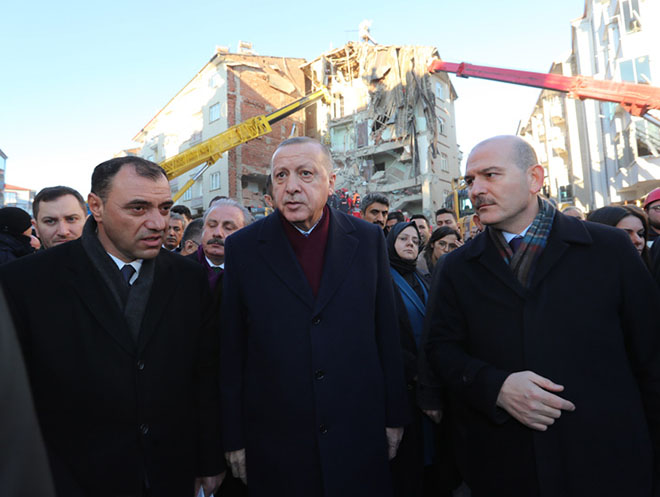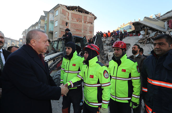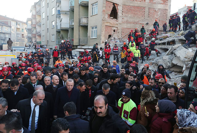 Cumhurbaşkanı Recep Tayyip Erdoğan, Elazığ’ın Sivrice ilçesinde meydana gelen 6,8 büyüklüğündeki depremin ardından, il merkezinde incelemelerde bulundu. Elazığ’da ilk olarak, depremde hayatını kaybeden Ayşegül Civelek ve oğlu Muhammed Salih Civelek’in Mevlana Camii'nde düzenlenen cenaze törenine katılan Cumhurbaşkanı Erdoğan, tabutlara bir süre omuz vererek Civelek ailesi ve yakınlarına başsağlığı diledi.