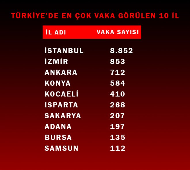 *Bütün illerimizde artık virüsün olduğunu biliyoruz. Burada görülen ön planda daha çok vaka İstanbul’da. İstanbul’daki vaka sayısı 8 bin 852, yüzde 60’lara yakın. 853 vaka İzmir, 752 vaka Ankara, 410 vaka ise Kocaeli.