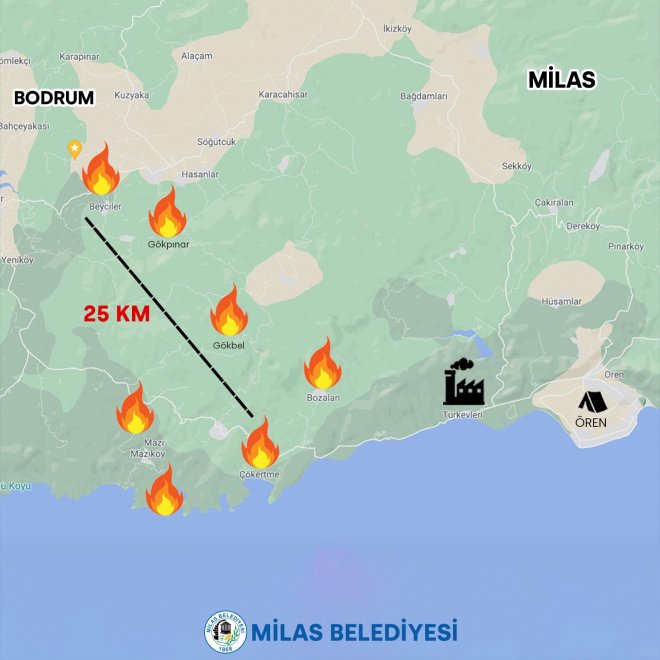 "31 Temmuz tarihinde Beyciler Mahallemizde başlayarak hala devam eden yangını haritalandırdık. Maalesef ciğerlerimiz yanıyor, yangın şuan da yoğun şekilde devam ediyor. Milas Belediyesi olarak hem yangın bölgesinde hem de Ören Stadyumu’nda oluşturduğumuz güvenli bölgede tüm önlemlerimizi aldık."