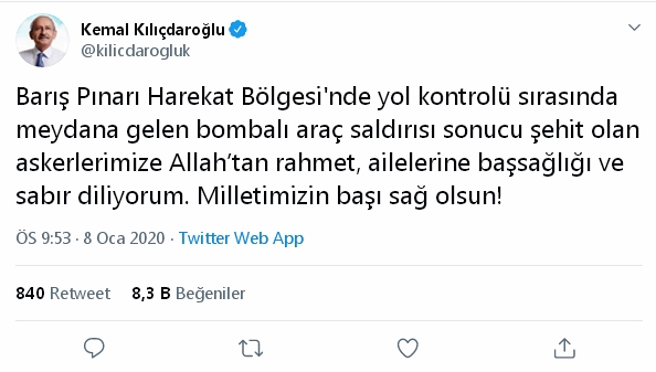 CHP Genel Başkanı Kılıçdaroğlu sosyal medya hesabından açıklamada bulundu. Bombalı saldırıda şehit olan 4 askerle ilgili Kılıçdaroğlu, “Barış Pınarı Harekat Bölgesi’nde yol kontrolü sırasında meydana gelen bombalı araç saldırısı sonucu şehit olan askerlerimize Allah'tan rahmet, ailelerine başsağlığı ve sabır diliyorum. Milletimizin başı sağ olsun!” ifadelerini kullandı.