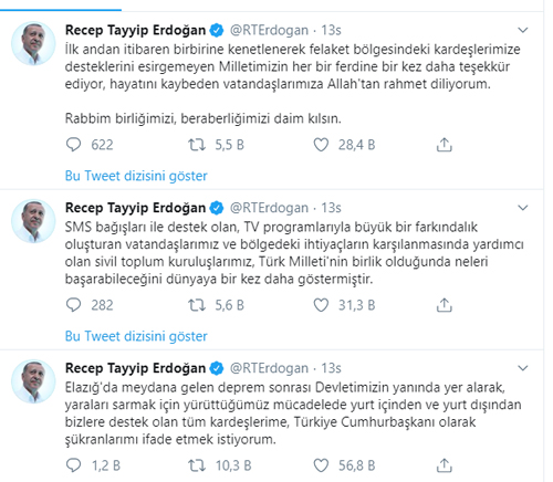 Cumhurbaşkanı Erdoğan, "Elazığ'da meydana gelen deprem sonrası Devletimizin yanında yer alarak, yaraları sarmak için yürüttüğümüz mücadelede yurt içinden ve yurt dışından bizlere destek olan tüm kardeşlerime, Türkiye Cumhurbaşkanı olarak şükranlarımı ifade etmek istiyorum.