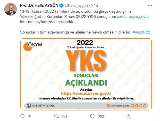 Prof. Dr. Halis Aygün, Twitter hesabından paylaştığı mesajda YKS 2022 sonuçlarının açıklandığını duyurdu. Aygün, açıklamasında “18-19 Haziran 2022 eğitimde sınavları gerçekleştirdiğimiz Yükseköğretimöğretim Kurumları (2022-YKS) http:// sonuc.osym.gov.tr internet sayfamızdan açıkladık. Sonuçların adaylarımıza ve ailelerine hayırlı olsun” ifadelerini kullandı.