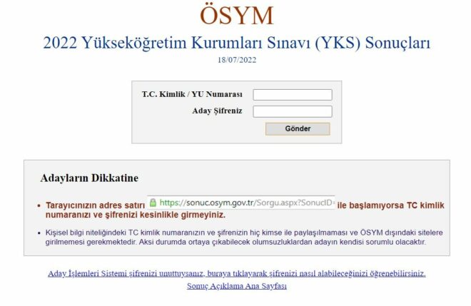 Sözcü'den edinilen bilgilere göre; adaylar, Yükseköğretim Kurumları Sınavı (2022-YKS) sonuçlarını sonuc.osym.gov.tr adresinden görebiliyor.