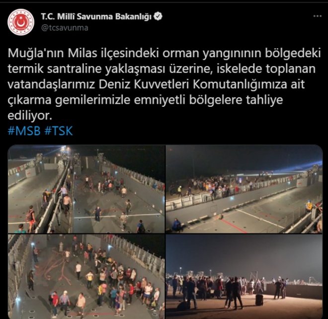 Milli Savunma Bakanlığı'nın Twitter hesabından yapılan paylaşımda, "Muğla'nın Milas ilçesindeki orman yangınının bölgedeki termik santraline yaklaşması üzerine, iskelede toplanan vatandaşlarımız Deniz Kuvvetleri Komutanlığımıza ait çıkarma gemilerimizle emniyetli bölgelere tahliye ediliyor." ifadeleri kullanıldı.