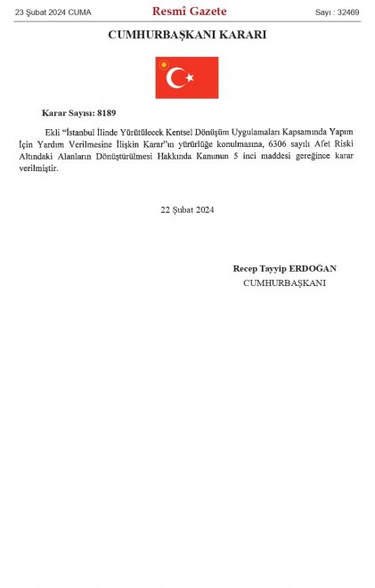 31 Mart Yerel Seçimleri'ne az bir zaman kala Resmi Gazete'de dikkat çeken bir karar yer aldı. Cumhurbaşkanı Recep Tayyip Erdoğan'ın imzasıyla yayımlanan karara göre, İstanbul'da yapılacak kentsel dönüşüm uygulamalarında vatandaşlara yardım yapılması yürürlüğe konuldu. Edinilen bilgilere göre; düzenlemeye göre, hak sahibine bir konut için 700 bin TL'ye kadar hibe, 700 bin TL'ye kadar kredi, bir işyeri için 350 bin TL'ye kadar hibe, 350 bin TL'ye kadar kredi, diğer her bir konut için 1 milyon 400 bin TL'ye ve diğer her bir işyeri için de 700 bin TL'ye kadar kredi verilebilecek.