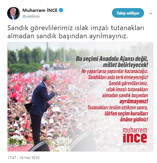 CHP, İYİ Parti ve HDP’den açıklama: -“Sandıkları terk etmeyin. Açıklanan sonuçlarla gerçek sonuçlar arasında fark var” -Muharrem İnce “sandıkların